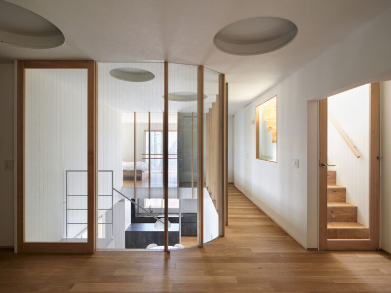 吉田豊建築設計事務所による、広島市の「牛田本町の家」。駅近の大小の建物が混ざる地域。周囲と調和する矩形の外観の中に、三世代の居場所を作りつつ“立体的な回遊動線”と“様々な抜け”で多様な空間体験を創出。将来の生活変化も想定され新たな二世帯住宅への改変も可能3階、ルーム5から吹抜方向を見る。 photo©田中克昌