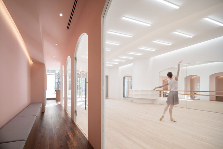 「舞台」となるレッスンルームは光を拡散させるために白い壁と滑らかな木肌が特徴の樺桜の床で仕上げ、エントランスと通路部分はブランドカラーである淡いピンクの壁とウォールナットの床を採用。レッスンルームと廊下間の開口や壁面沿いの堀込みは上部をアーチ形状とし、鏡の反射により空間全体に連続感と広がりを与えている。