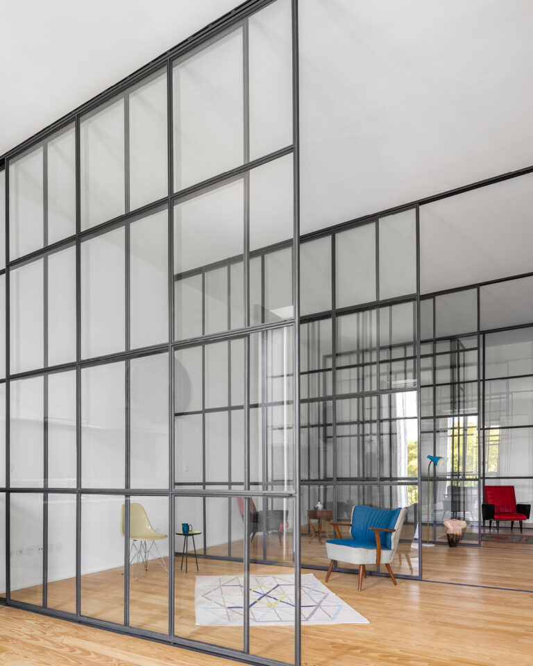 内部では、目立つ階段が改修され、ほとんど何の価値も残っていない部屋は、必要最低限にまで浄化されました。そして、その部屋の周囲は、等間隔に配置されたガラスの壁で埋め尽くされました。