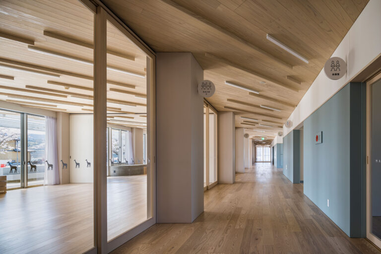 柿木佑介+廣岡周平 / PERSIMMON HILLS architectsによる、福島・双葉郡の「楢葉町地域活動拠点施設『まざらっせ』」。元保育所の公民館を更に改修。避難解除後の住民と移住者が共に活動する場として、新設建具がもたらす“開放性”と家具類がつくる多様な“居場所”を備えた空間を考案。新たな交流を受入れ混ざり合う“舞台”を作る 廊下、左:スタジオ1、右:会議室 photo©中山保寛