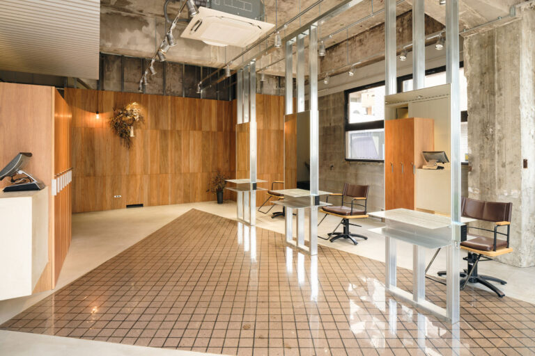 キーマテリアルとして同じ素材が建物全体に散らばることで、ファサードやエントランスなどの共用部とテナントの専有エリアとが全く別空間となってしまっているよくある雑居ビルとの差別化を狙い、共用部と各テナントが少しでも連続性を持ち、それぞれのテナントのためのビルのように見え始めることを期待した。