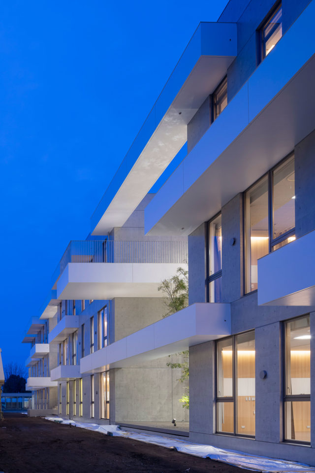 3階はプライベートスペースであるが、3・4階を縦方向の連窓とし、適度に壁を設けてプライバシーを確保しながら外観に統一感を持たせた。5階の休憩スペースは周辺建物の上方に抜けが期待できるため横連窓を設け、遠方の都市的な風景や近くの寺社の緑が眺められるようにした。