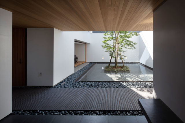 メインの執務スペースである2階は吹抜けを介して奥側に設け、広がりを持たせるのと同時に道からの距離を取り、プライバシーを確保している。