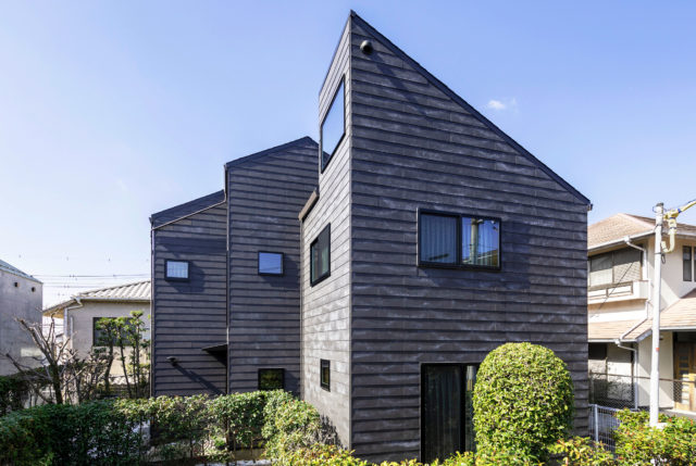竹本卓也建築研究所による、大阪・豊中市の「刀根山の家」。高度地区の敷地に建つ設計者の自邸。斜線制限下でも“過不足のない家”を目指し、廊下等を設けず“14の空間”を“9の層”で繋げる構成を考案。多様な形状の開口等を散りばめて空間に更なる変化も与える外観 photo©笹の倉舎 笹倉洋平