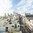 ニイノ建設と麻生征太郎建築設計による、東京・大田区の「大森町の集合住宅」。活気のある商店街の中での計画。賑わいを享受しつつも“落ち着ける”住環境”を目指し、四周に回した“コンクリートの帯”の高さを変えて内外の関係を調整する建築を考案。上階に行くほど段階的に開放度を上げる屋上 photo©関拓弥
