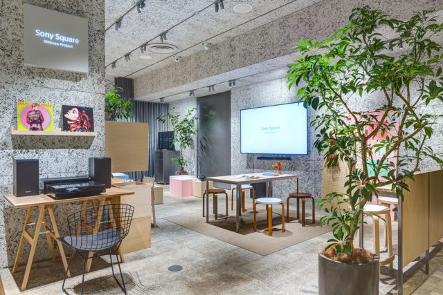 レセプションを壁側に持ってきたことで、南西側に大きくある窓に面したエリアは、可変性を持たせ、通常時にはラウンジ的に、イベントがある際はプレゼンターに集中できるようプランを行った。結果、ユニットシーティング、スツール、窓際のベンチシートをグリーンと共に組み合わせていくレイアウトとなった。これらの家具の一部であるスツール、テーブル、シェルフはオリジナルデザインのものを採用しており、木工メーカーの端材で製作が可能なようにデザインしている。