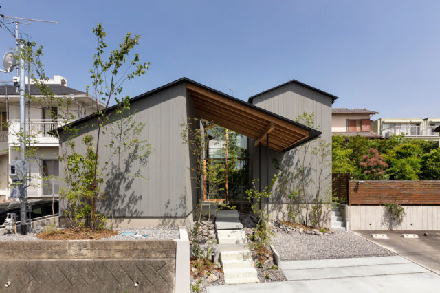 後藤周平建築設計事務所による、静岡・浜松市の「山手の家」。作品を集める施主家族の為に計画。生活と収集物が混ざり合う場を目指し、内外に8つのレベル差があり多方向に“視線が抜ける”構成を考案。展示する写真を窓に見立て実際の開口と並置して内部空間に奥行きも与える外観、南西から敷地を見る。 photo©長谷川健太