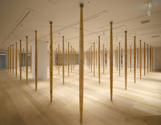 床、壁、天井、柱などの空間的要素は常に人や物の背後にありながら意識に上ることが少ない存在ですが、それがあることで空間の感じ方に実は大きな影響を及ぼしているはずで、そう意識して見るととても興味深い存在だと思います。展示とは無関係でありながら展示と関係し展示に影響を与えてしまう空間というものを、展示室に一時的に現れた仮設の柱を通じて味わってもらえたらと思いながらこのような展示を考えました。