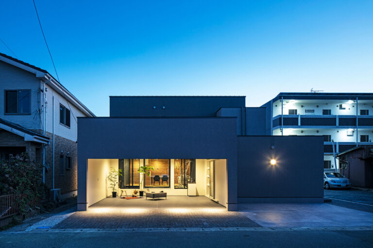 高塚陽介 / TYdo architectsによる、静岡・磐田市の「西町の住宅」。祭典が盛んな地区での計画。祭り仲間で話し合える場を持つ住居との要望に、人が集まる“半屋外リビング”と“家族リビング”を備えた建築を考案。二つの居間の間に中庭を設けて必要に応じて空間の分節も可能にする