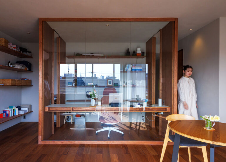 五十嵐淳建築設計事務所による、北海道の「House in Hokkaido」。本州から移り住む施主の為の住居。“ローカリティ”への応答と“普遍性”の獲得を目指し、多様な視点と働きかけに応えられる“おおらかな”空間を志向。時間の経過で“室名らしきもの”が移り変わる建築を造る 1階、「広間1」から物置側を見る。 photo©佐々木育弥