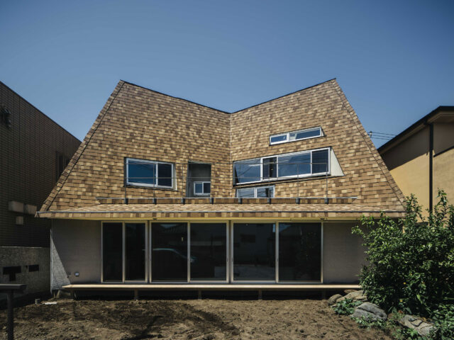 住宅街での計画です。建築家は、窮屈にならず“余白を感じられる”住まいとして、内部空間と繋げて使用可能な“エクステリアリビング”としてのテラスを備えた建築を考案しました。また、テラス周辺のヴォリュームの操作で開放性と親密さも両立しています。