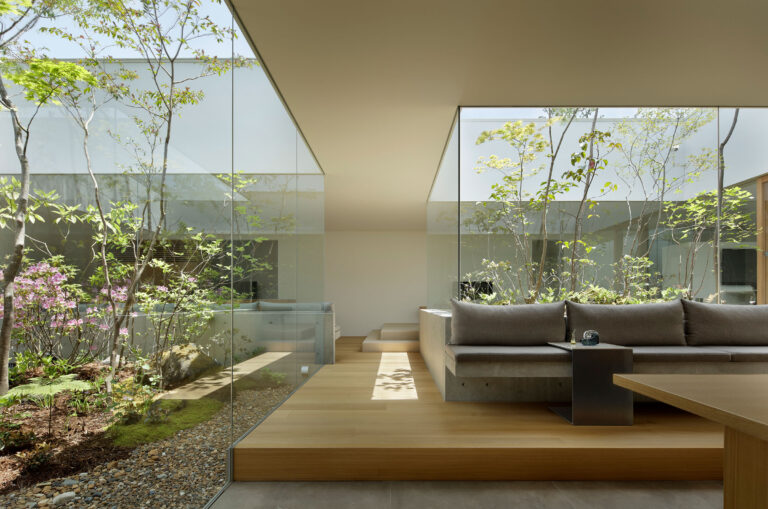 桑原淳司建築設計事務所による、兵庫の「香花園の家」。閑静な住宅街に建つ設計者の自邸。家と緑が一体的に感じられる空間を求め、無柱の長方形空間から“くり抜く”様に3つの中庭を設けた建築を考案。庭の配置や床の高低差で“森の中を移動”する様な感覚も生み出すリビングと中庭2 photo©繁田諭