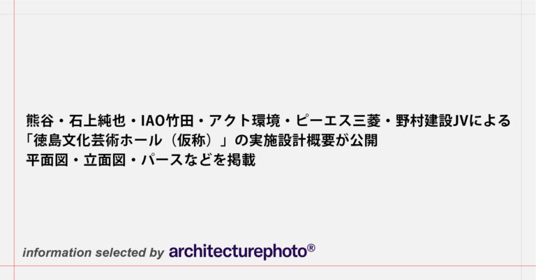 熊谷・石上純也・IAO竹田・アクト環境・ピーエス三菱・野村建設JVによる「徳島文化芸術ホール(仮称)」の実施設計概要が公開されています。平面図・立面図・パースなどを掲載しています。リンク先は徳島県のサイトにアップされたPDFファイルです。アーキテクチャーフォトでは、基本設計時のパースも特集記事として紹介しています。