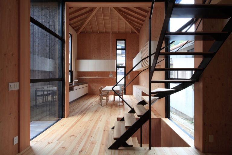 STA土屋辰之助アトリエによる、千葉・いすみ市の別荘「SHouse IS」。眼の前に川と海を望む敷地での計画。建具を用いた流動性を高める設計などで、常に“外部”を感じながらも“包まれる”様な感覚の内部空間を構築。リビングでは“シンプルな表現”で自然への開放性を確保する2階、リビング、ダイニング、キッチン photo©井上登