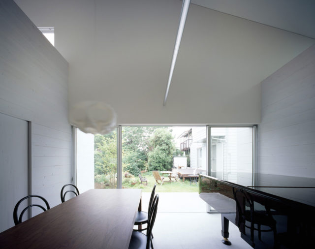 緑地に面する北欧家具店を営む施主の為の住宅です。建築家は、竣工後に置かれる家具類の把握から出発し、簡素で実直な品々を納める為の“器”としての空間を志向しました。そして、風景と家具の存在感と釣り合う“A”型の架構を持つ建築を造りました。