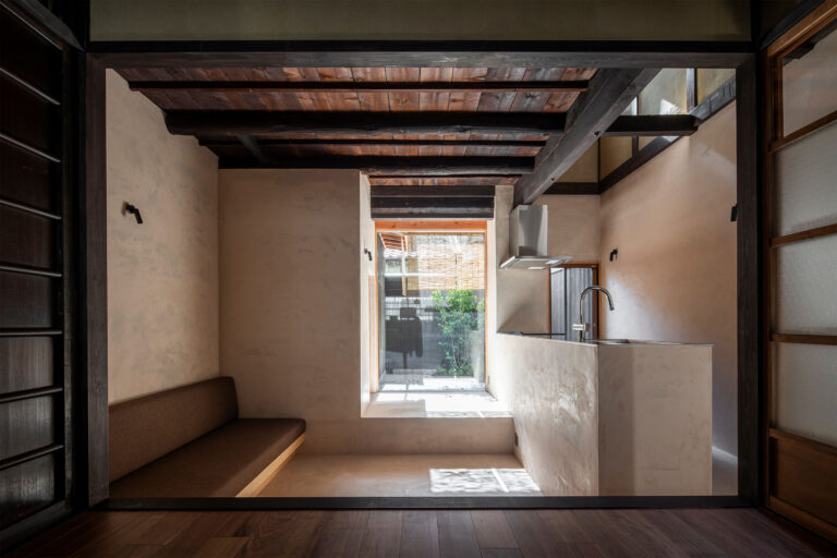 池田隆志+池田貴子 / design itによる、京都市の「金閣寺東の町家」。京町家を在宅勤務の施主の為に改修。かつての“職住一体の豊かさ”も継承する為、既存空間の“役割”を可能な限り残す設計を志向。原型を留めない土間だけは新たな場として“モルタルで包まれた”リビングとする