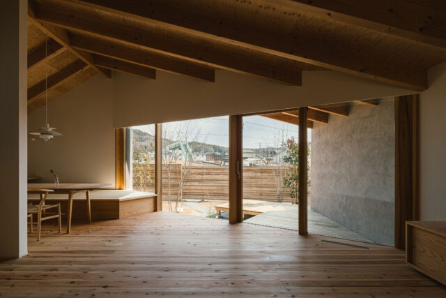 鈴木岳彦建築設計事務所による、京都市の「醍醐の家」。山並みを望む住宅地に計画。この場の“暮らしの可能性”を追求し、“広大なパノラマ”と“家族の親密な生活”が関係を持ち“日常を形成”する在り方を志向。山々と向き合う三角形平面の居間が中心にある建築を考案1階、居間からキッチンを見る。 photo©貝出翔太郎
