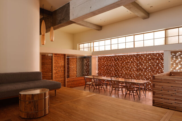ワークエリアの天井は国産針葉樹のルーバーを設置して、天井内設備機器を隠しながら木材の質感で自然で温かみのある空間とした。このルーバーは準不燃にする必要があったが、注入式の場合、節のないA材にする必要がある。そこでよりコストも安く素材感もある節ありのB材やC材でも準不燃にできる塗膜タイプとしている。この塗膜タイプは認定上松材にする必要があったため、国産の唐松を採用した。