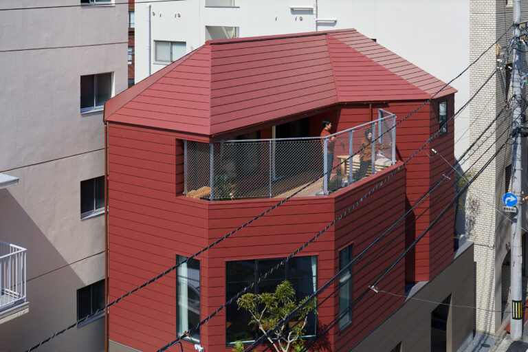 桶川容子 / marutau arquiによる、愛媛・松山市の「OCTA HOUSE」。高い建物に挟まれた商業地域の敷地。要望に応えつつも“余白”のある住宅を目指し、最大限の量塊を確保した上で各角をカットして“隅切り”を作る構成を考案。内部空間は“求心性”と“安心感”を備えた空間となる外観、南側より見下ろす。 photo©矢野紀行