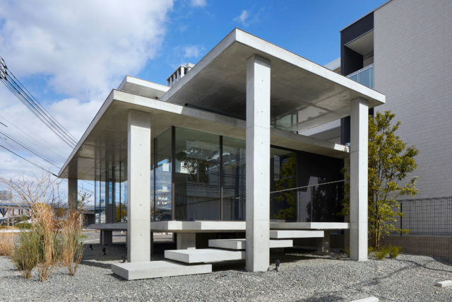 This residence was designed for a married couple. It is on a long, narrow site that slopes gently toward the back, and its three sides were surrounded by apartments and a cemetery, so the location feels like the bottom of a valley. The adjacent cemetery was like a forest, with plants crossing over into the site and blurring the boundary, making the site itself to look like part of the cemetery. Having these site features, an “Okinawa-like” building style with large openings seemed somehow inappropriate for this location. Here, we envisioned a bright, open architecture while keeping a distance from its surroundings.
