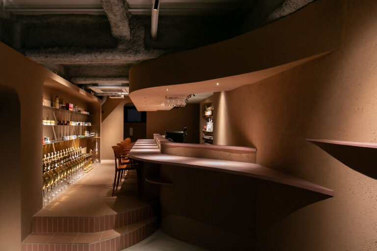武田慎太良+篠元貴之+住野裕樹 / MYSTによる、愛知・名古屋市の店舗「ESSENCE」。アロマ等の香りを扱うカフェバーの内装計画。様々な表情を見せる“魅惑的な煙”を参照し、強弱や緩急があり“奥へと誘なう”空間を志向。平安時代から使われる深みのある色を用いて動きのある場に落ち着きも与えるカウンターの詳細 photo©森田真悠