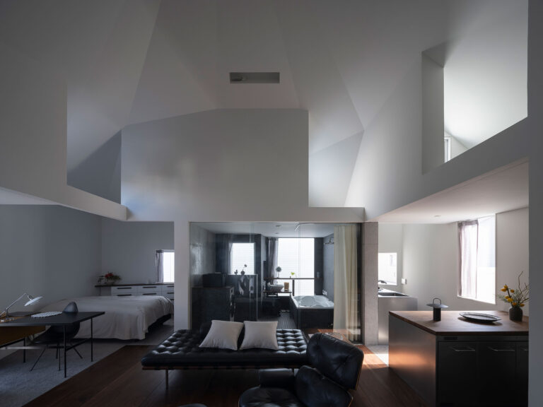- 高田彩実 / ayami takada architectsによる、東京・港区の住戸改修「room T」。人が行き交う街に建つ集合住宅内での計画。“都市のオアシス”の様な場を求め、既存柱をリブウォールで包囲し天井を折り上げて“白い巨樹”に見立てる計画を考案。造作類への天然素材の使用で空間に質感も付与する