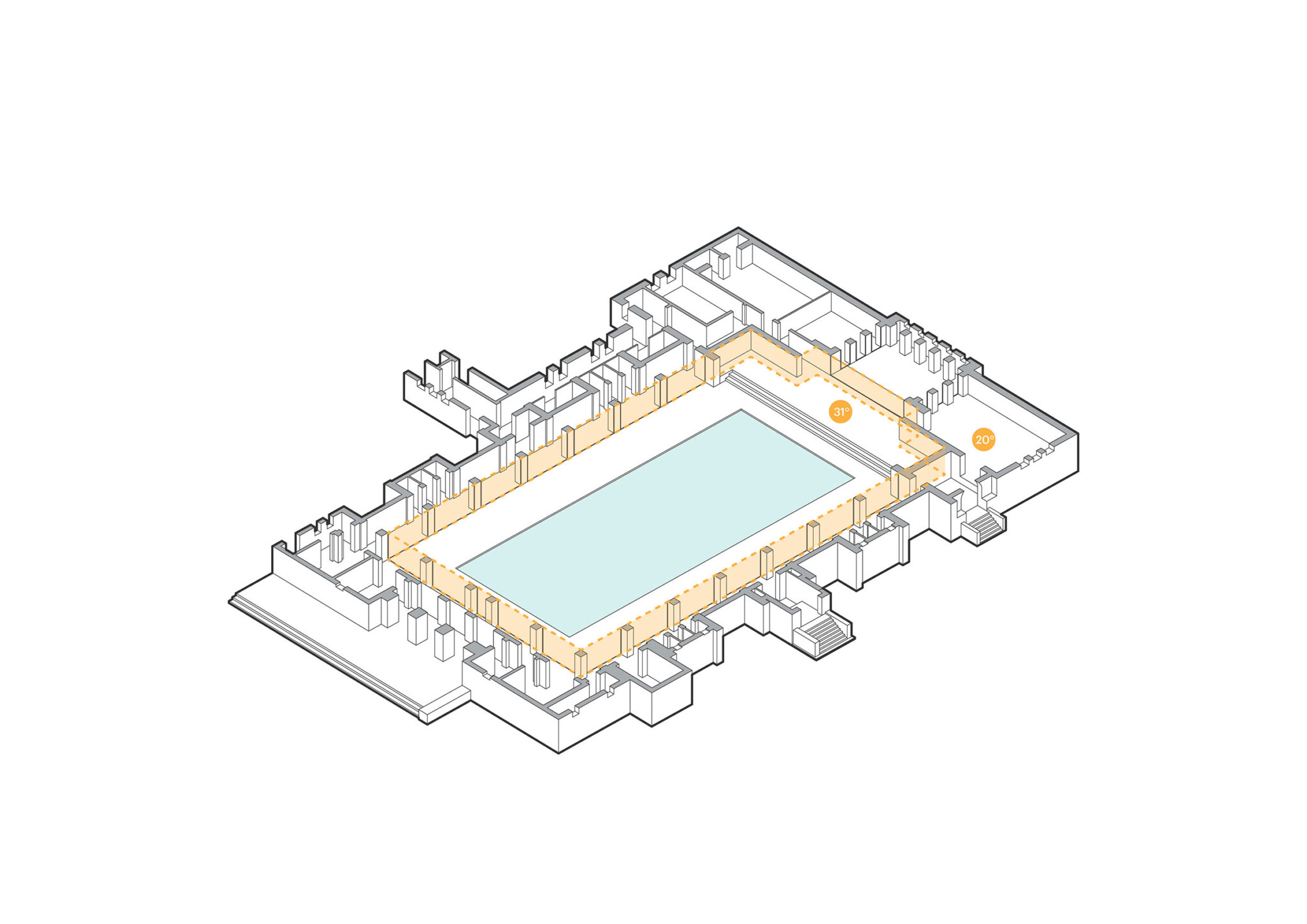 新しいモザイク床が、プール周辺と可動式のプール床の両方を彩ります。これは、教会の既存の色彩、素材、そしてステンドグラスの窓を参照するものとなります。この床のデザインは、ヘールレンに数多く存在する壁画への参照として、地元のアーティストとの協働で制作されます。プールの上にある照明は、歴史的な写真に見られる元の教会のランプから着想を得ており、4列に並んだランプはスイマーのためのレーンガイドとしても機能します。