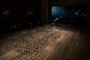 We arranged one thousand thirty-nine titanium plates of 50x25mm in a grid pattern by type to produce nine low tables of various sizes. When viewed from the sofa, the light-reflecting titanium plates give the impression of continuity with the video, with their appearance constantly shifting.