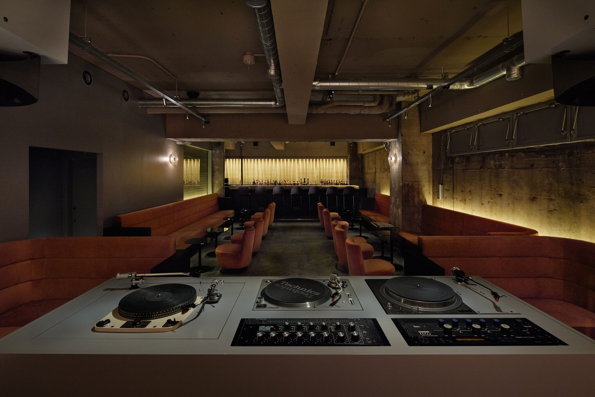 トラフ建築設計事務所による、東京・渋谷区の「濤 TOH」。隠れ家的な環境にあるリスニングバー。音楽を楽しむ様々な状況をイメージして、DJカウンターを囲むVIP席・重心の低いソファ席・発光天板のカウンター席を用意。音響面では“伝統と最先端の同居”も意図する 手前:DJカウンター、奥:VIP席 photo©阿野太一