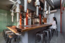 既存の2店舗を新築で統合する計画です。建築家は、面積の最大化に加えて将来の賃貸利用も想定し、視界が広がり複数の空間を確保できる“スキップフロア”の建築を考案しました。そして、雰囲気の継承を意図して内装はラフで簡素な仕上げとしました。店舗の場所はこちら(Google Map)。