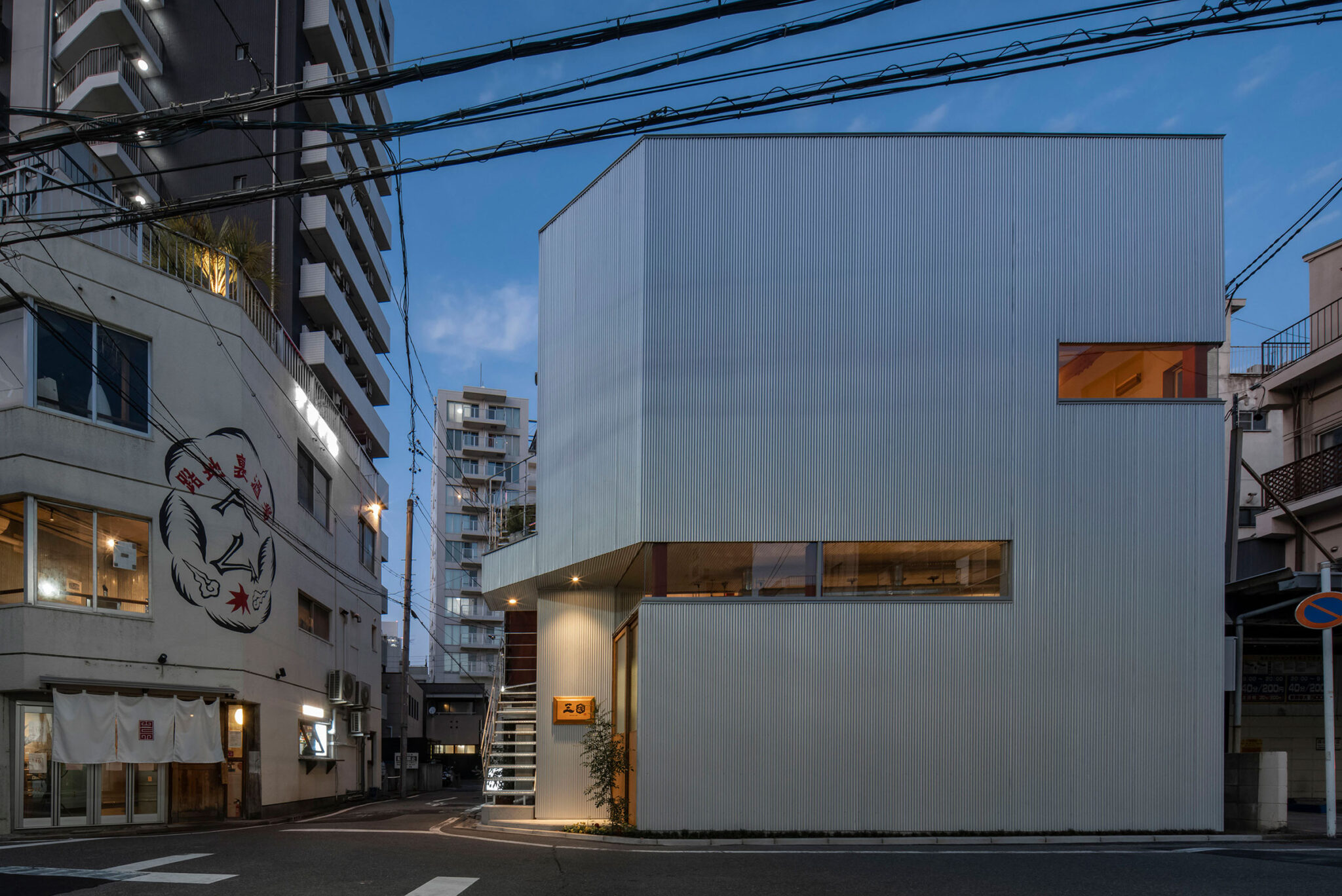 宇野享+良知康晴 / CAnによる、愛知・名古屋市の「焼肉 三國」。既存の2店舗を新築で統合する計画。面積の最大化に加えて将来の賃貸利用も想定し、視界が広がり複数の空間を確保できる“スキップフロア”の建築を考案。雰囲気の継承を意図して内装はラフで簡素な仕上げとする外観、西側の道路より見る。夜景 photo©ToLoLo studio
