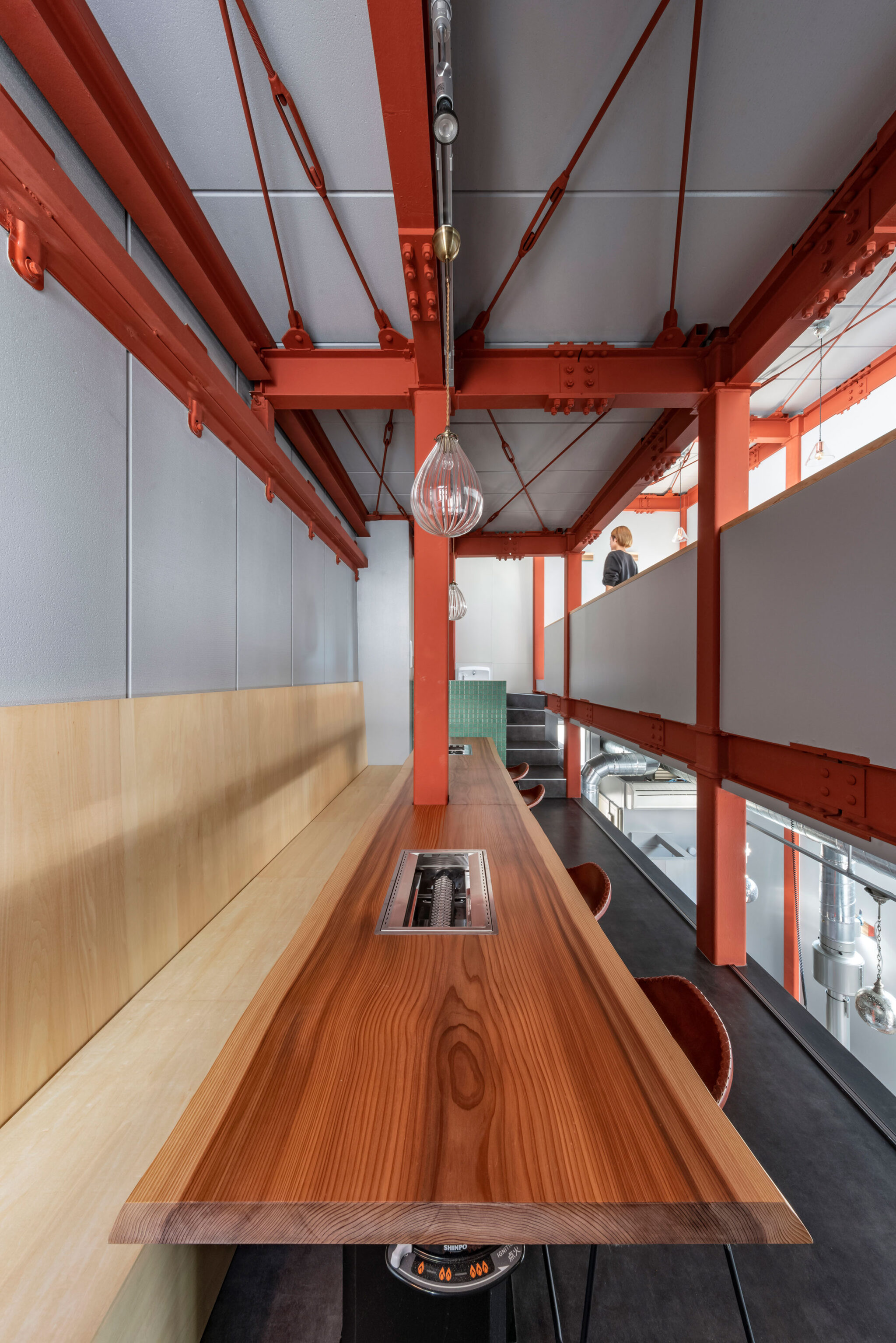 既存の2店舗を新築で統合する計画です。建築家は、面積の最大化に加えて将来の賃貸利用も想定し、視界が広がり複数の空間を確保できる“スキップフロア”の建築を考案しました。そして、雰囲気の継承を意図して内装はラフで簡素な仕上げとしました。店舗の場所はこちら(Google Map)。