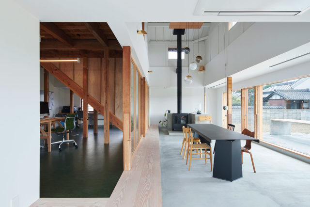 今津康夫 / ninkipen!による、奈良市の「NEW LIGHT POTTERY 高畑」。歯科医院を転用した照明器具ブランドのショップ・オフィス・ファクトリー。屋根裏に“膨大な気積”のある既存を舞台とし、照明だけでなく輝きや反射などの“様々な光の現象に満ちた空間”を志向2階、1階への階段側から「ランチルーム」と「オフィス2」を見る。 photo©河田弘樹