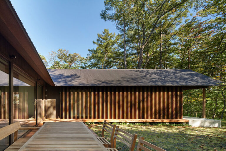 岡田一樹 / R.E.A.D. & Architectsによる、長野・軽井沢町の「Villa M」。“森そのもの”が残る敷地。沢山のゲストを迎える別荘として、施主と来客のプライバシーを確保できる“鍵ノ字状”に曲がる平面構成を考案。建築を環境に溶け込ませる為に既存木の樹皮の色を参照した外壁とするテラス1 photo©Daici Ano