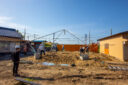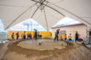 池田靖史・下田悠太・林盛による、千葉・館山市の「POP-UP ORIGAMI ROOF」。海辺の地域での相撲の土俵に屋根を掛ける計画。“折り紙の動き”を応用し、膜を引張材としカーボンパイプ等を圧縮材とした“テンセグリティ構造”の屋根を考案。超軽量を活かして人力作業かつ低コストで完成させる施工中の様子(建築家による解説:現地での鉄骨の仮組み。作業はすべてセルフビルドで行った) photo©コミヤ写真館