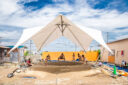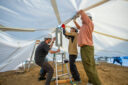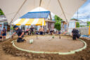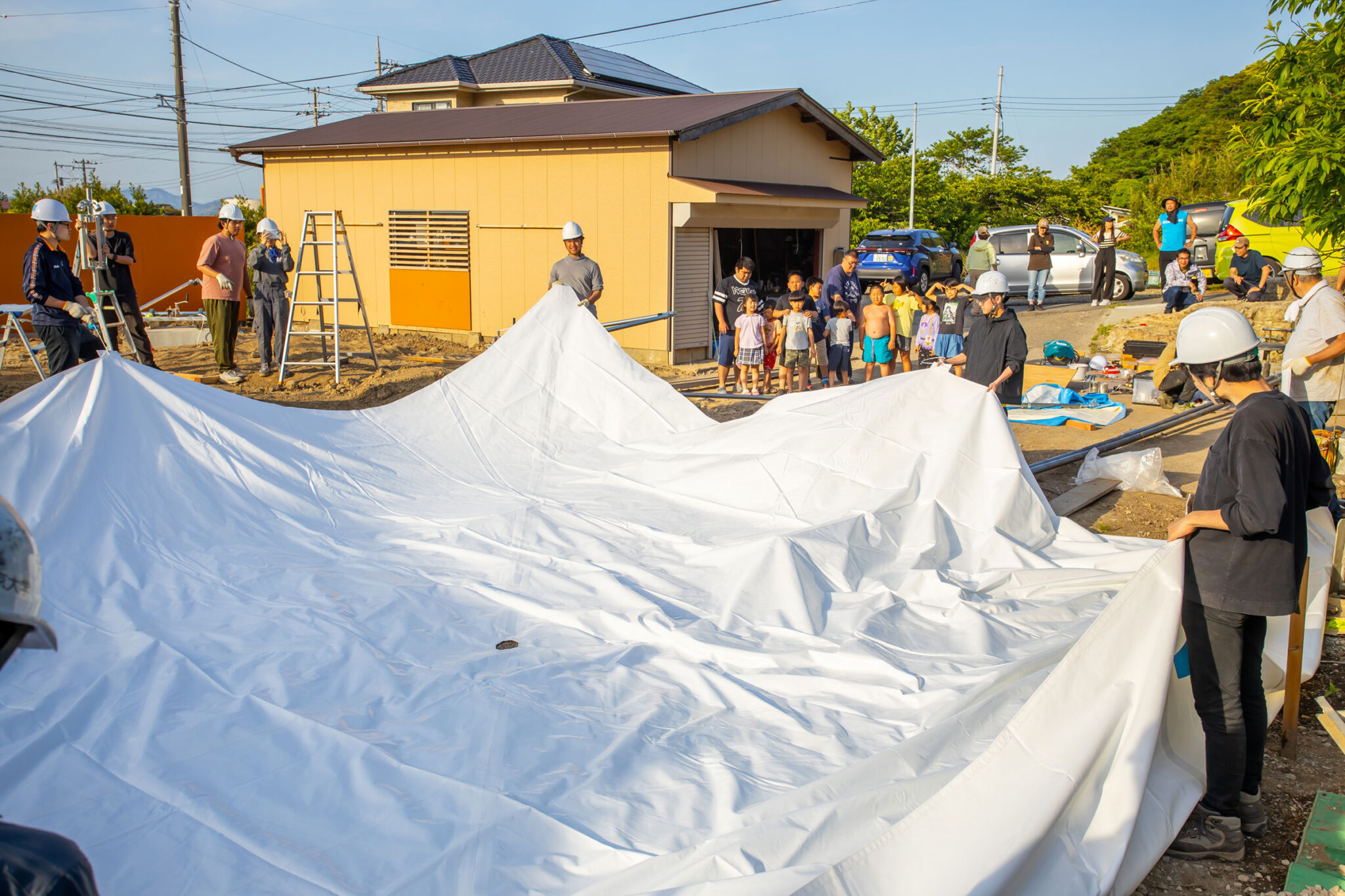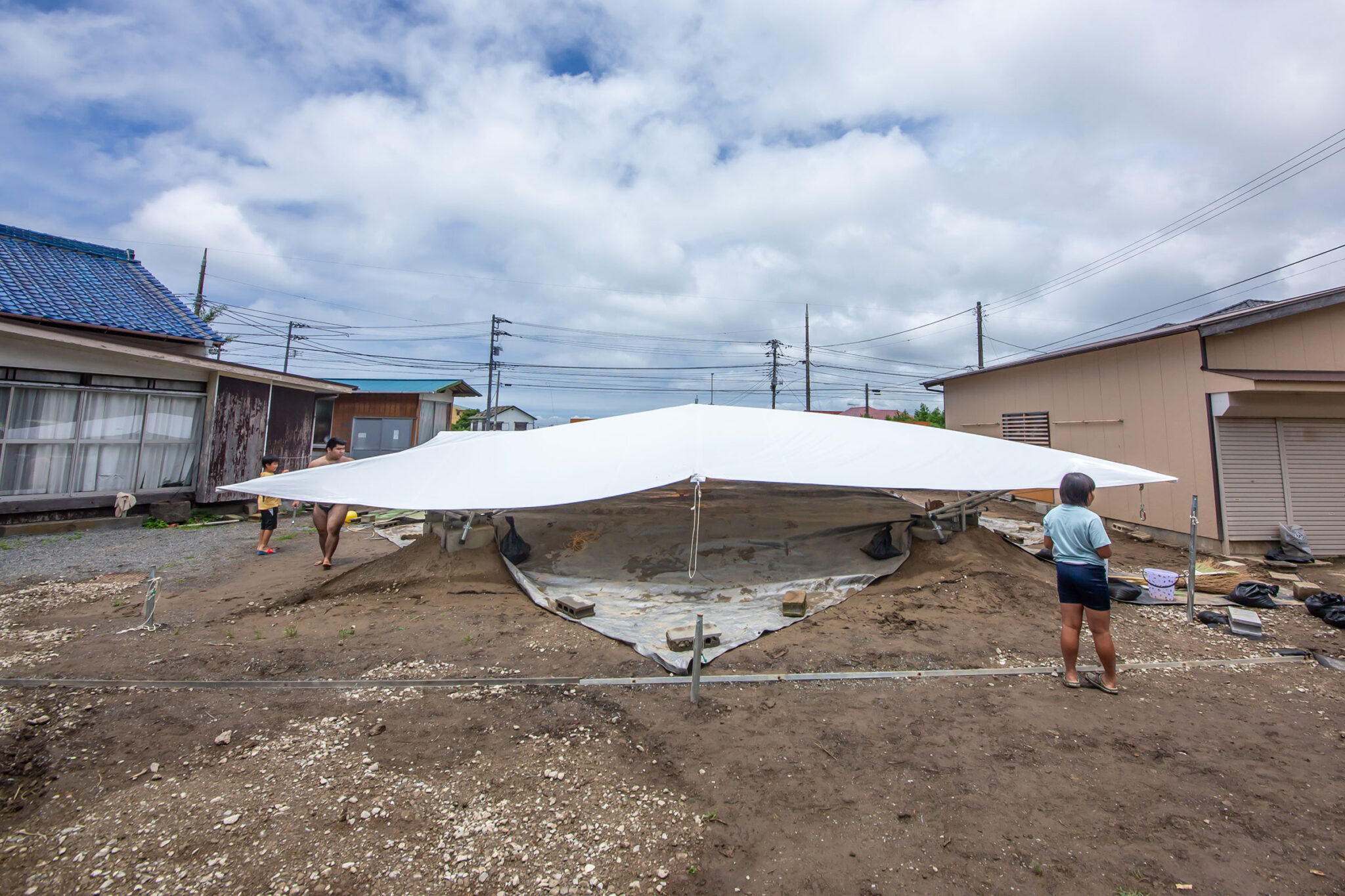池田靖史・下田悠太・林盛による、千葉・館山市の「POP-UP ORIGAMI ROOF」。海辺の地域での相撲の土俵に屋根を掛ける計画。“折り紙の動き”を応用し、膜を引張材としカーボンパイプ等を圧縮材とした“テンセグリティ構造”の屋根を考案。超軽量を活かして人力作業かつ低コストで完成させる施工中の様子(建築家による解説:屋根完成後、土俵の整備を現地の子供たちと行った) photo©コミヤ写真館