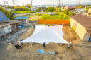 池田靖史・下田悠太・林盛による、千葉・館山市の「POP-UP ORIGAMI ROOF」。海辺の地域での相撲の土俵に屋根を掛ける計画。“折り紙の動き”を応用し、膜を引張材としカーボンパイプ等を圧縮材とした“テンセグリティ構造”の屋根を考案。超軽量を活かして人力作業かつ低コストで完成させる施工中の様子(建築家による解説:現地で膜を固定する作業を上空から見る) photo©コミヤ写真館