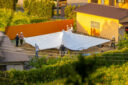 池田靖史・下田悠太・林盛による、千葉・館山市の「POP-UP ORIGAMI ROOF」。海辺の地域での相撲の土俵に屋根を掛ける計画。“折り紙の動き”を応用し、膜を引張材としカーボンパイプ等を圧縮材とした“テンセグリティ構造”の屋根を考案。超軽量を活かして人力作業かつ低コストで完成させる施工中の様子(建築家による解説:膜材を鉄骨に固定) photo©コミヤ写真館