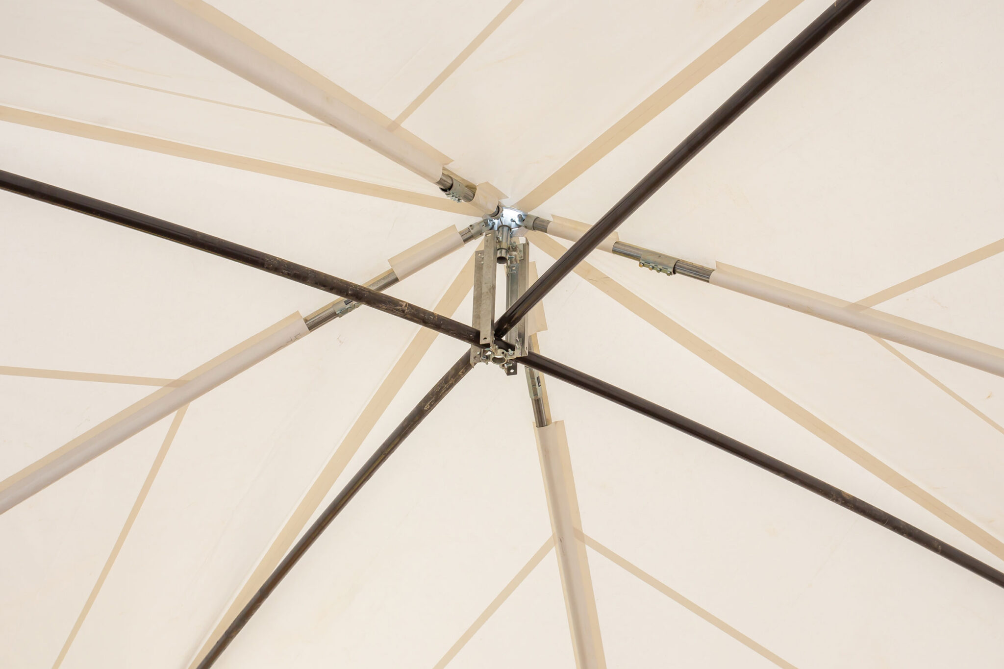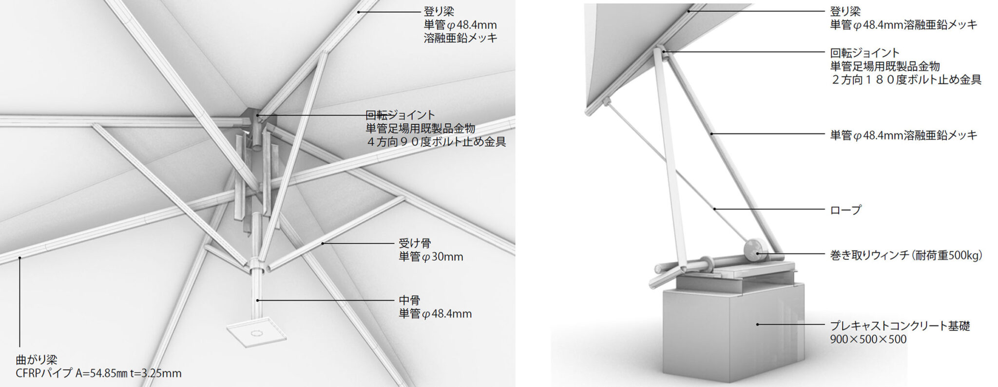 軽量化のために膜を引張材、CFRPパイプと単管を圧縮材としたテンセグリティ構造とし、CFRPは他の骨組みとは接合しておらず膜とのバランスだけで浮いている。CFRPは立ち上げの過程で弓なりに曲がっていき、その反発力で膜に張力が導入されて構造が常に安定するアクティブベンディングを利用した仕組みとした。