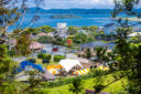 池田靖史・下田悠太・林盛による、千葉・館山市の「POP-UP ORIGAMI ROOF」。海辺の地域での相撲の土俵に屋根を掛ける計画。“折り紙の動き”を応用し、膜を引張材としカーボンパイプ等を圧縮材とした“テンセグリティ構造”の屋根を考案。超軽量を活かして人力作業かつ低コストで完成させる俯瞰、南側より見下ろす。(建築家による解説:四隅の柱についたウィンチを4人で回すことで、屋根を立ち上げる。屋根の高さは5,575㎜。土俵の向こうには浦賀水道と沖ノ島が見える) photo©コミヤ写真館