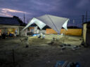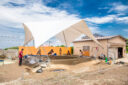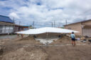池田靖史・下田悠太・林盛による、千葉・館山市の「POP-UP ORIGAMI ROOF」。海辺の地域での相撲の土俵に屋根を掛ける計画。“折り紙の動き”を応用し、膜を引張材としカーボンパイプ等を圧縮材とした“テンセグリティ構造”の屋根を考案。超軽量を活かして人力作業かつ低コストで完成させる施工中の様子(建築家による解説:屋根の膜材は現地で鉄骨に止付けた) photo©コミヤ写真館