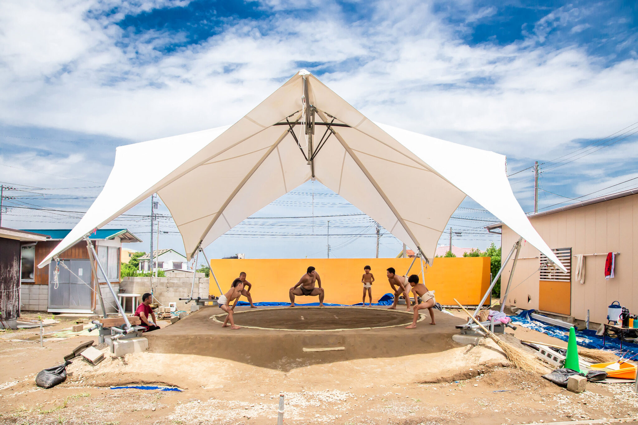 海辺の地域での相撲の土俵に屋根を掛ける計画です。建築家たちは、“折り紙の動き”を応用し、膜を引張材としカーボンパイプ等を圧縮材とした“テンセグリティ構造”の屋根を考案しました。また、超軽量を活かして人力作業かつ低コストで完成させました。