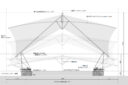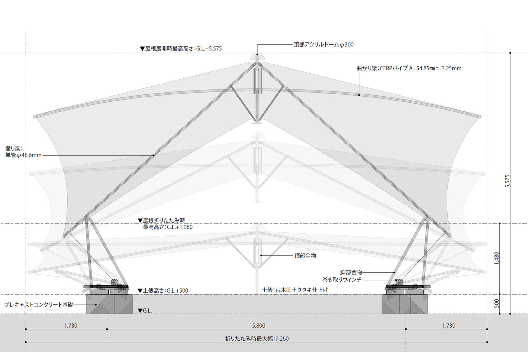 池田靖史・下田悠太・林盛による、千葉・館山市の「POP-UP ORIGAMI ROOF」。海辺の地域での相撲の土俵に屋根を掛ける計画。“折り紙の動き”を応用し、膜を引張材としカーボンパイプ等を圧縮材とした“テンセグリティ構造”の屋根を考案。超軽量を活かして人力作業かつ低コストで完成させる断面図 image©池田靖史+下田悠太+林盛
