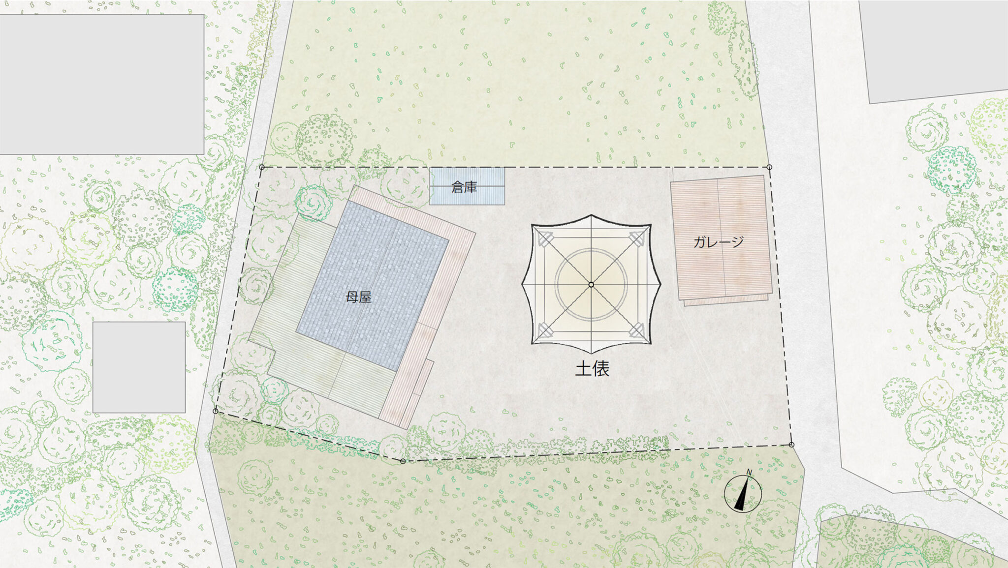 鈴木雅也建築設計事務所による、千葉・松戸市の「仲井町の家」。景観と採光や通風に恵まれた土地での計画。“心地よい原初的な”住まいを目指し、間口や棟間隔の調整などで母屋・中庭・離れが一体となる建築を考案。状況に応じて各々が居場所を見つけられる“寛容な空間”も意図