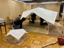 池田靖史・下田悠太・林盛による、千葉・館山市の「POP-UP ORIGAMI ROOF」。海辺の地域での相撲の土俵に屋根を掛ける計画。“折り紙の動き”を応用し、膜を引張材としカーボンパイプ等を圧縮材とした“テンセグリティ構造”の屋根を考案。超軽量を活かして人力作業かつ低コストで完成させる1/3スケールのモックアップ photo©林盛