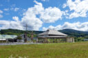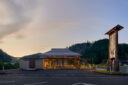 市営店舗の再建計画です。建築家は、蕎麦の文化や地域の伝統も感受できる場を目指し、周辺家屋を参照した“入母屋”を地場の木材と技術を用いた“CLTパネル”で造る建築を考案しました。また、山並と呼応する三次元曲面の庇で人と風景も繋いでいます。店舗の場所はこちら(Google Map)。