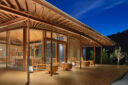 田中裕一+中本剛志 / STUDIO YYによる、岡山・真庭市の「蒜山そばの館」。市営店舗の再建計画。蕎麦の文化や地域の伝統も感受できる場を目指し、周辺家屋を参照した“入母屋”を地場の木材と技術を用いた“CLTパネル”で造る建築を考案。山並と呼応する三次元曲面の庇で人と風景も繋ぐ客席からWC側を見る。夜景 photo©秋田広樹 エスエス