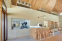 田中裕一+中本剛志 / STUDIO YYによる、岡山・真庭市の「蒜山そばの館」。市営店舗の再建計画。蕎麦の文化や地域の伝統も感受できる場を目指し、周辺家屋を参照した“入母屋”を地場の木材と技術を用いた“CLTパネル”で造る建築を考案。山並と呼応する三次元曲面の庇で人と風景も繋ぐ厨房側から客席を見る。 photo©秋田広樹 エスエス