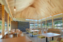 田中裕一+中本剛志 / STUDIO YYによる、岡山・真庭市の「蒜山そばの館」。市営店舗の再建計画。蕎麦の文化や地域の伝統も感受できる場を目指し、周辺家屋を参照した“入母屋”を地場の木材と技術を用いた“CLTパネル”で造る建築を考案。山並と呼応する三次元曲面の庇で人と風景も繋ぐエントランス側から客席を見る。 photo©秋田広樹 エスエス