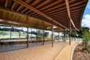 地震時水平力の大半を厨房側に流すことで客席部分の大開口を実現することで、繊細な鉄骨フレームと木材の化粧垂木のみで構成した緩やかな三次元曲面を持つ下屋の縁側とのつながりを生み出し、周辺環境とのシームレスな関係をつくっている。